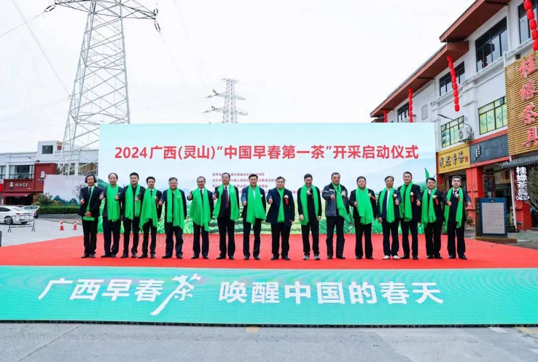 2024广西(灵山)“中国早春第一茶”开采启动仪式上,还举行了炒茶出征授旗、广西茉莉六堡茶斗茶颁奖、灵山县人民政府与广西茶叶流通协会签订《广西灵山县茶叶品牌营销推广战略合作协议》等环节。农业农村部相关单位、广西相关厅局和市县业务部门负责人,全国多地茶叶社团组织、企业代表及市民群众也共同参与了启动仪式。海内外的众多茶友、茶商和热心网友线上收看了活动直播。