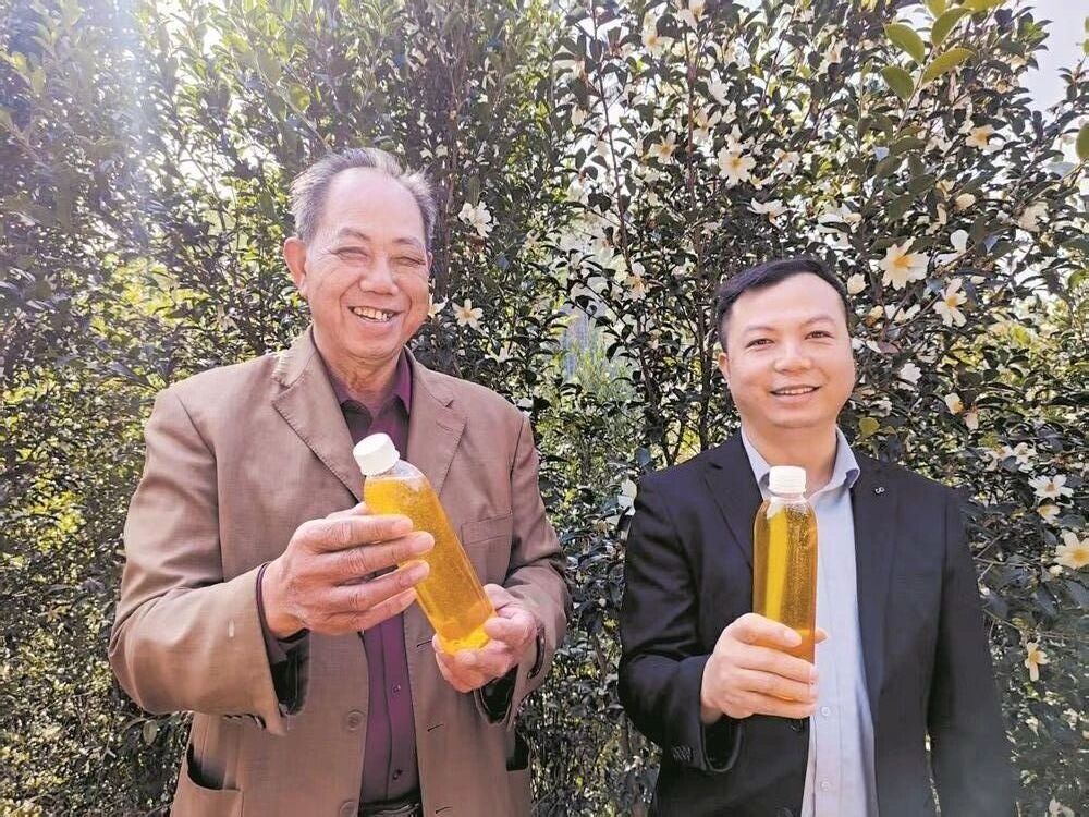 黄绍迎(右)与父亲在油茶园里展示刚榨出来的山茶油。周顺彬 摄